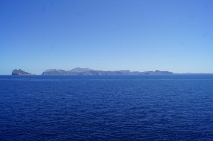 Попытались позагорать на ветреном месте возле бассейна — не вариант — сдувает. Быстро замерзли и переместились на корму к мини гольфу. Никакого ветра, минимум людей и отличный вид на Майорку, а также остров Дракона.