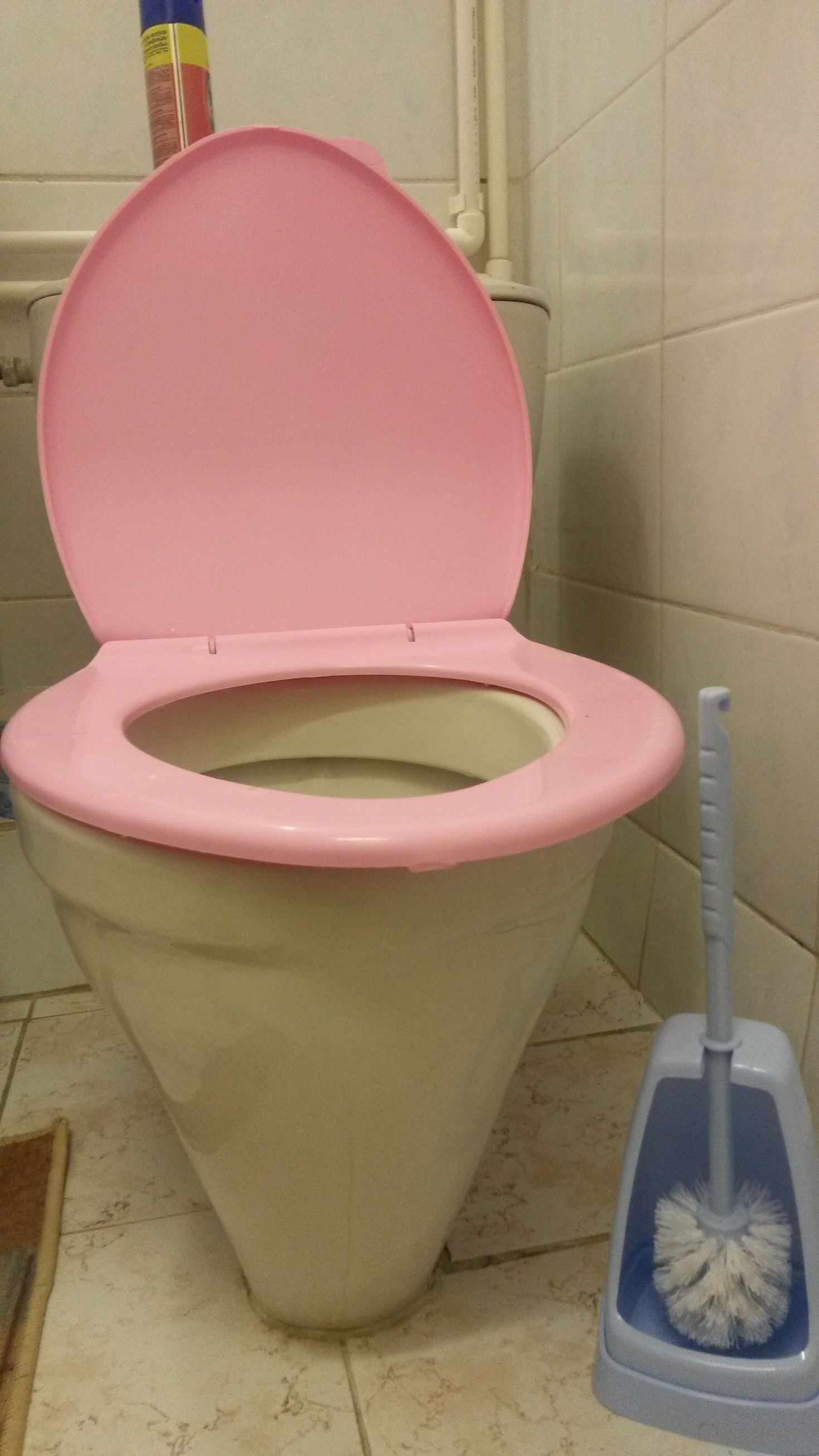 Особенное удивление вызвал унитаз. Не только нелепым цветом крышки, но и высотой. Простой ёршик гордо возвышается над ним. Сразу вспомнился фильм «Белое солнце пустыни». Помните начало? Лысая голова из горячего песка торчит, но она такая позитивная.