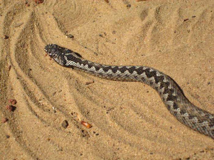 А сразу за поселком начинается царство Илецко-Иковского бора, простирающегося на многие десятки километров. И первым меня на лесной дорожке встречает лесной страж — болотная гадюка: