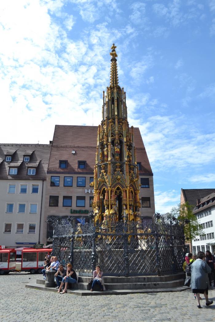 Еще чуть ниже и попадаешь на площадь ярмарки Хауптмаркт. На ней находится “Прекрасный фонтан”, довольно интересная готическая хрень, как бы фонтан, но весь позолоченный и состоит из 4 ярусов фигур и все это ограждает ажурный забор. Не знаю, почему назван фонтаном, скорее это башня с золотыми фигурками. Но красиво.