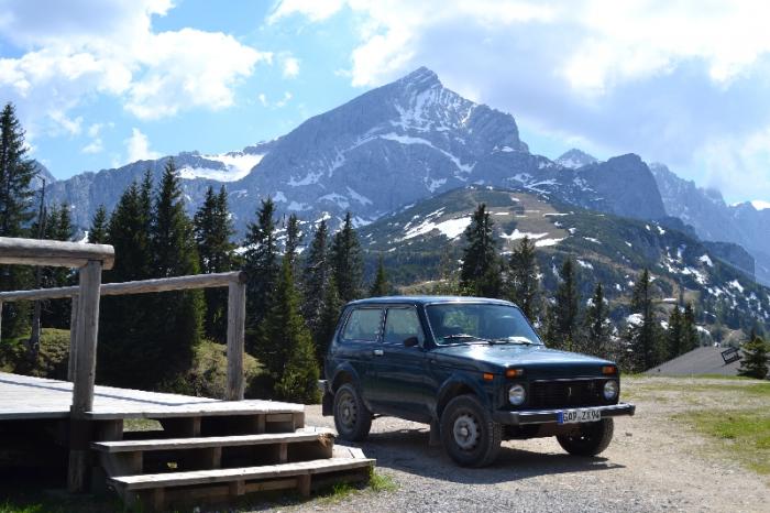 наверху увидели гордость российского автопрома – Ниву. Действительно, какой еще доступной машине так легко взобраться по горному серпантину на двухтысячную отметку.