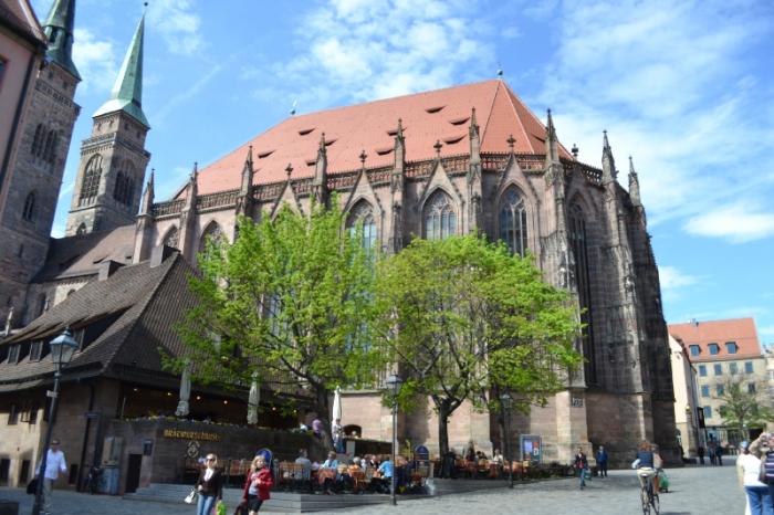 Спускаясь вниз, прохожу через ряд достопримечательностей: величественную Ратушу, внушительную церковь Св.Себальда, рядом с которой находится местный ресторанчик, с национальной едой. Очень вкусно и дешево (1 литр пива, супчик и мясное второе обходится до 15 евро).