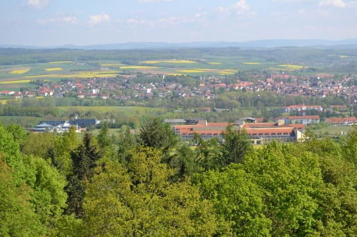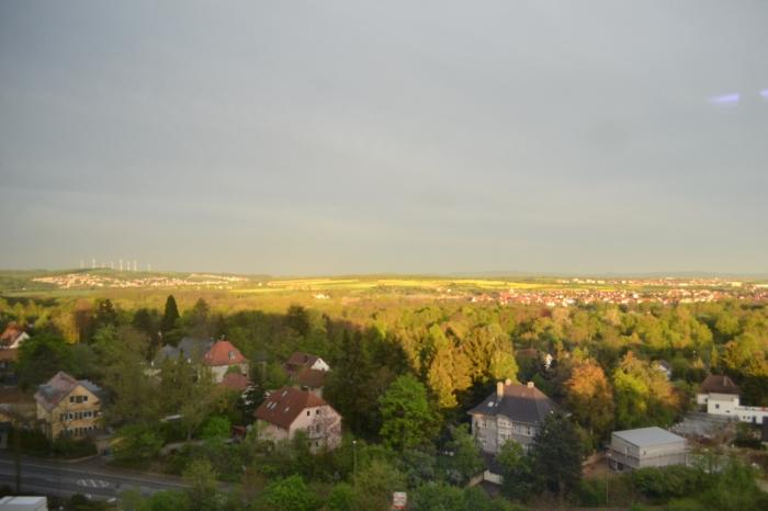 с шикарными видовыми характеристиками на зеленые холмы, Майн, деревеньку, ветряными мельницами слева и атомной электростанцией справа.