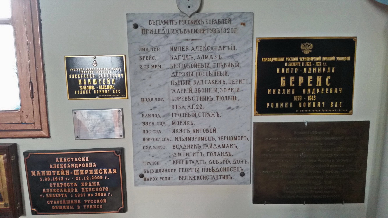 Иконы и утварь, украшающие сегодня храм, были взяты из корабельных церквей, подсвечниками послужили снарядные гильзы, а на доске из мрамора золотом выбиты названия всех 33 боевых кораблей, которые ушли из Крыма в Бизерту. Этот храм действует в Тунисе и сегодня.