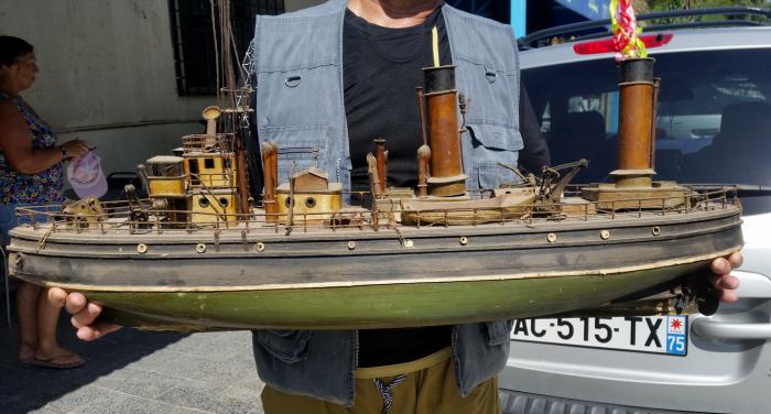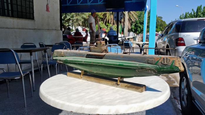 Эти две увесистые модели, корабля и подводной лодки – и уже в достаточно ветхом состоянии – выставлены сегодня в прихожей небольшого арабского кафе в Табарке. Трудно сказать, как они туда попали. Спасибо хозяину, который позволил снять эти модели с закрепленных довольно высоко на стене стеклянных полок и вынести на улицу, на свет, где их стало возможным сфотографировать.