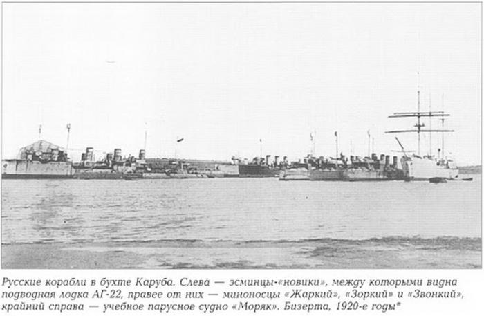 В период с 8 декабря 1920 года по февраль 1921 года флотилия, сведенная в Русскую эскадру, перебазировалась в тунисский порт Бизерту. На кораблях эскадры, помимо матросов и офицеров флота, находилось еще немалое количество беженцев, включая казаков, корниловцев и технические войска.