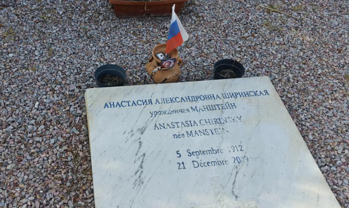 Мы постояли у могилы Анастасии Манштейн-Ширинской. Здесь же, справа, лежит её сын Сергей Ширинский, умерший в 2013 году. А позади могилы Анастасии Александровны покоится ее отец — Александр Сергеевич Манштейн.