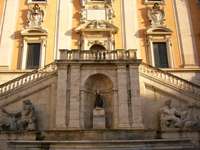 Фасад дворца Сенаторов украшает двойная элегантная лестница, в нише расположена статуя Минервы. С двух сторон от Минервы находятся гигантские фигуры, символизирующие Нил и Тибр…
