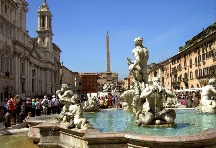 Первый фонтан — фонтан Мавра — стоял на площади с конца XVI в., но фигура Мавра выполнена по эскизам Бернини одним из его учеников, а остальные фигуры относятся к XIX столетию…