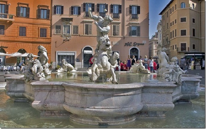 На севере Пьяцца Навона красуется третий фонтан — Фонтан Нептуна. Мощная фигура морского бога, разящего своим трезубцем осьминога, добавила характера городскому водоему. Авторство скульптурной группы фонтана Нептуна принадлежит зодчему Антонио делла Бита…