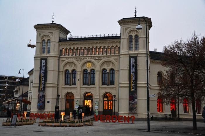 Место выбрали не случайное: Нобелевский центр мира, открытый в 2005 году. Я к своему глубокому изумлению только в эту поездку узнала, что нобелевская премия мира в отличие от наград за точные науки вручается не в Стокгольме, а в Осло. Причина – недавняя история Норвегии в качестве самостоятельного и независимого государства. В этом здании находится экспозиция, рассказывающая об истории нобелевской премии мира, справа от входа – сувенирный магазин, слева – ресторан. Вот мы налево и пошли.