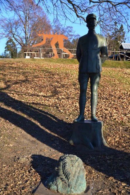 Добравшись до своей станции, мы с удовлетворением обнаружили, что вокруг лежит плотный густой туман. С указателями на Хольменколлен было напряжно, не говоря уж об указателях к отелю. Видимость никакая. По какой-то интуиции мы выбрали верное направление, и даже через пару сотен шагов в гору обнаружили указатель отеля. Впереди рядом с дорожкой замаячил неподвижный силуэт человека. Не без опаски приблизившись, я с облегчением обнаружила, что это скульптура, твердо стоящая на чугунном пеньке. Утром мы его прояснили:
