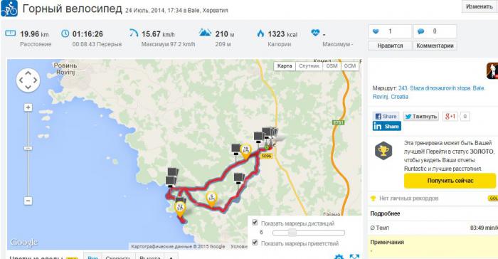 Изучая её, я узнал важную вещь. Оказывается, в Хорватии есть целое велосообщество, которое весьма и весьма популярно как у местных, так и у приезжих. И карта эта как раз указывала на сайт сообщества в регионе – При этом информация на карте кореллировала с данными сайта. У меня на смартфоне уже стояла программа — Runtastic для горного велосипеда. В ней есть навигация и карта, немного адаптированная для горного велосипеда, с тропами и дорогами-дорожками – в принципе гОдно. А на бумажной карте было указано порядка 10 веломаршрутов. Старт, финиш, рельеф, СЛОЖНОСТЬ… Ну и его номер и даже название. Как на фото. Это было интересно и это мотивировало.