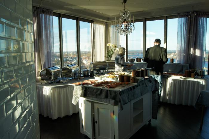 Бронировали мы, будучи ещё в Москве, через . И правильно сделали. Народу тьма, а так без очереди на лифт. Уютный столик на двоих с видом на Стокгольм с высоты 150 метров нас уже ожидал. В ресторане самообслуживание в виде шведского стола, напитки разливают и подают официанты.