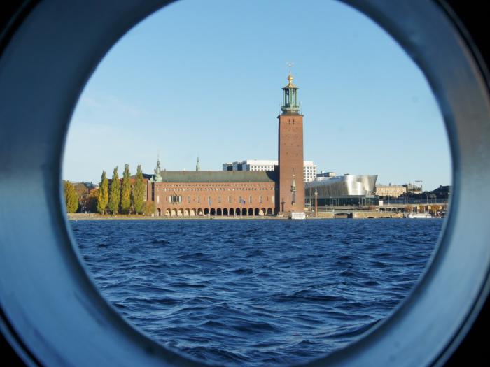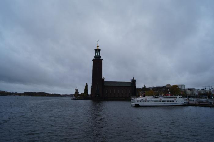 Первой остановкой для фотографирования стала Стокгольмская ратуша. Она пейзажно расположилась на берегу озера Меларен… или Балтики… разве там поймёшь!
