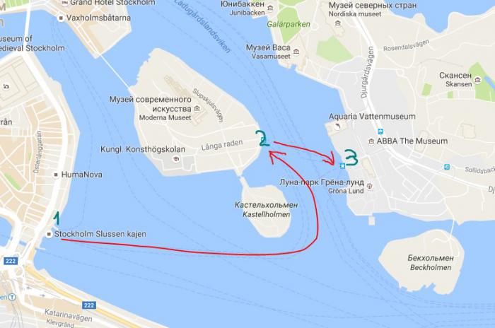 Маршрут нашего парома был такой, как на карте. Конечной остановкой для нас был остров Djurgården (Юргорден), дословно переводится как «звериные угодья».