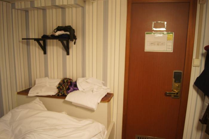 Каюта у нас была компактная: 3 на 3 метра, включая ванну и душ. Кровать не очень удобная. (фото делал вечером)