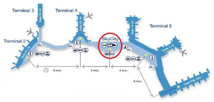 Обычно международные рейсы (зона Шенгена) приземляются и взлетают из Терминала 5. На карте отметил остановку автобуса и поезда-экспресса.