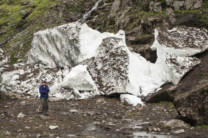 Проехав еще немного, увидели огромную ледяную глыбу, лежащую у подножья горы и упавшую видимо с нее когда-то давно, судя по толстому слою грязи на поверхности.