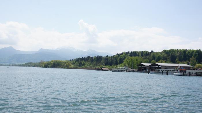 Вот так, любуясь открывающимися видами, мы и доехали до городка Приен – ам – Кимзее. Парковку выбрали в двух шагах от билетных касс на кораблики, купили билеты и поплыли на остров Херренинзель, где расположен еще один из замков легендарного Людвига II, последнего короля Баварии.