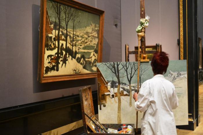 Оба раза, когда мы были в венском Музее истории искусств, напротив «Охотников» стояла одна и та же женщина и в который по счету раз переносила на холст знакомые очертания: