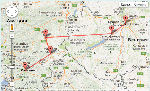 Вдоволь нагулявшись по Любляне, промокнув нафик, мы забрали машину с подземной парковки отеля и направились в сторону Будапешта. Решили ехать по вот такому маршруту
