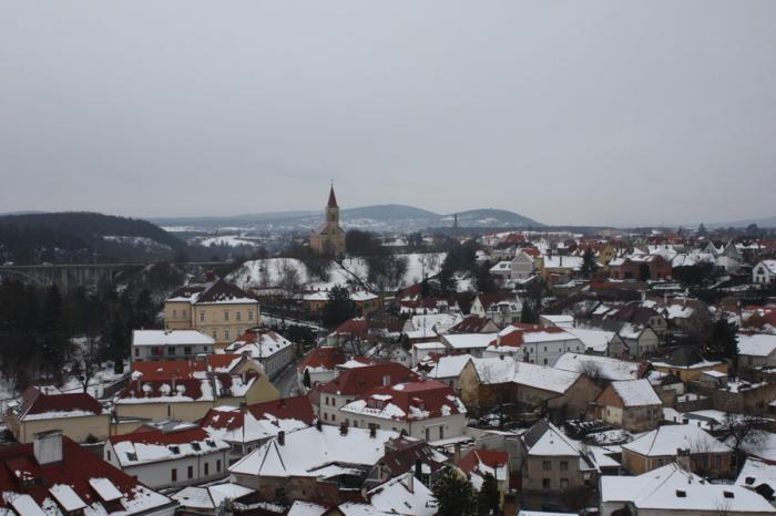Мы были там во время католической Пасхи, ехали из Словакии (Nové Zámky ) по бесплатной дороге 82 – 122 км, 3 часа. Дорога идет через деревни, поля, леса иногда с крутыми поворотами, поднимаясь и спускаясь, в одной деревне вдали видели разрушенный замок (из-за ливня решили не останавливаться). Итак о городе: