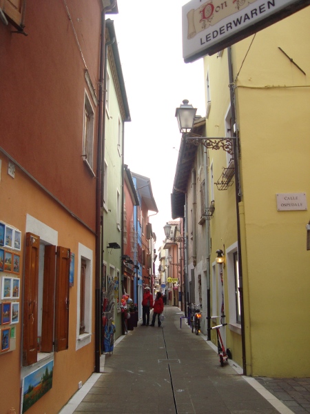 Я более подробно расскажу про Каорле. На мой взгляд, его отличительной чертой от обычных приморских курортов является то, что он сохранил свой исторический центр. Ведь раньше Каорле был обычной рыбацкой деревушкой. Еще его называют «маленькой Венецией», только вместо калле-каналов там калле-улицы. На мой взгляд, домики в центре Каорле такие же разноцветные и красивые, как на острове Бурано в Венеции.