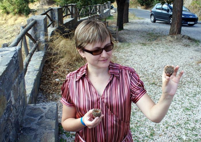 В этот день я понял, что настоящего серпантина до этого еще не видел. Дорога упорно карабкалась вверх, местами попадались смотровые площадки. На одной из них Юлька обнаружила Греческие желуди – они раз в 5 больше наших, привычных и немного напоминают голову джигита в лохматой папахе.