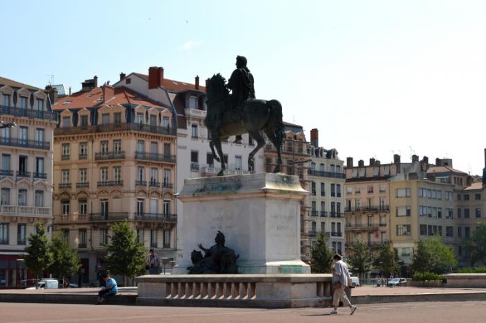 На площади находится памятник Людовику XIV.