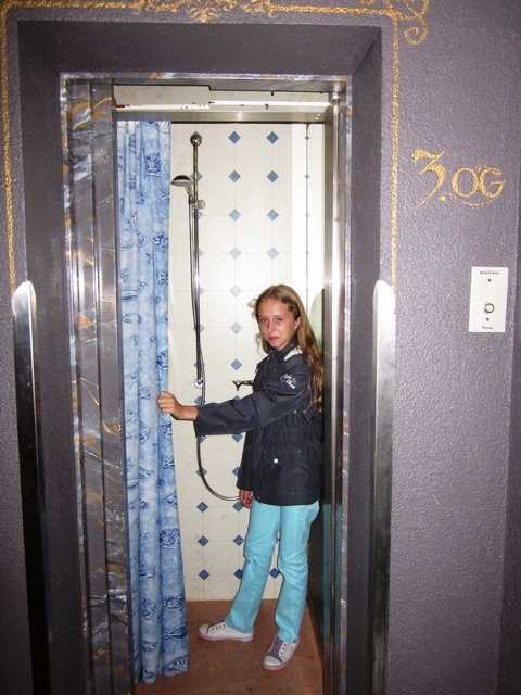 Стоимость проживания в отеле не включала завтрак. Но утро вечера мудренее. Очухавшись к утру и памятуя о безуспешной попытке накануне вечером утолить голод, мы решили начать день предсказуемо. В ресторан решили спуститься на лифте, но вместо этого оказались… в душе. Дело в том, что кабина лифта оказалась стилизованной под душевую кабину.