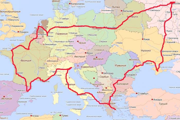 Маршрут: Москва, Минск, Брест, Варшава, Берлин, Бохум, Кёльн, Амстердам, Брюссель, Париж, Ле-Мон-Сен-Мишель, Ла-Рошель, Барселона, Канны, Ницца, Монако, Венеция, Рим, Помпеи, Бари, Игуменица, Афины, София, Бухарест, Одесса, Крым, Запорожье, Днепропетровск, Москва.