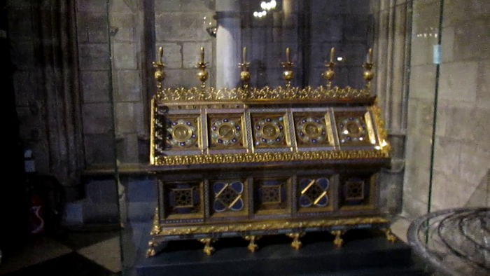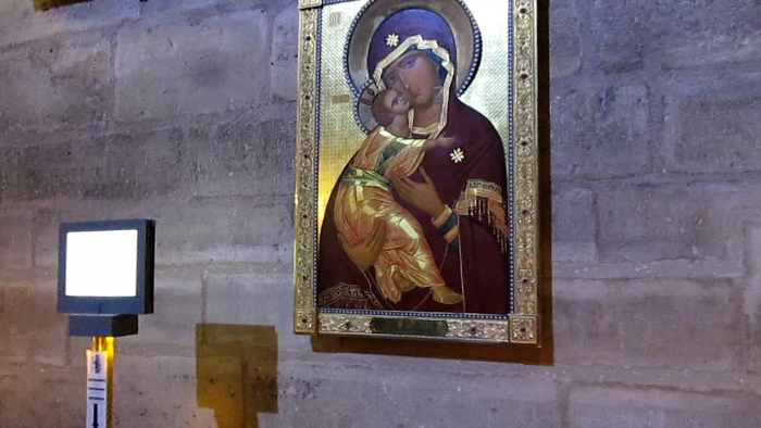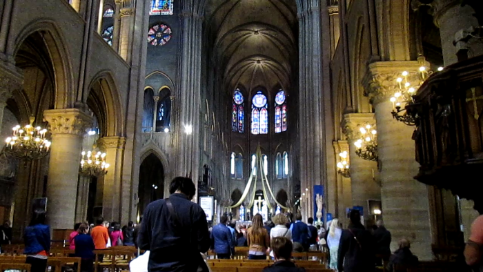 В Собор мы вошли с огромной группой туристов, которая тут же начала подниматься по лестнице на смотровую площадку. Шла служба. Очень красиво пели священник и, видимо, приглашенная оперная певица. Поток людей на смотровую площадку не прекращался и мы, решив, что кроме спин и голов ничего не увидим, остались внизу. В отличие от Православных Католики не украшают свои храмы и единственной иконой там была Владимирская Божья Матерь. Патриарх Московский и Всея Руси Алексий II во время визита во Францию в 2007 году преподнес собору Нотр-Дам де Пари Образ Владимирской Божьей Матери. С тех пор там совершаются православные молебны. Но то, что собор возводился в период 1163—1345 годов вызывало какие-то сказочные, мистические чувства. К сожалению, фотографировать в храме запрещено. Все фото с видеосъемки.