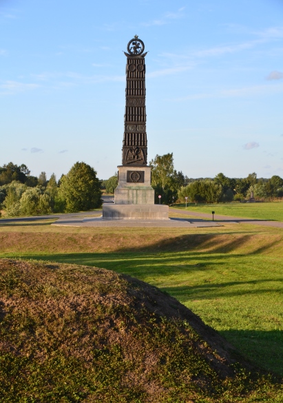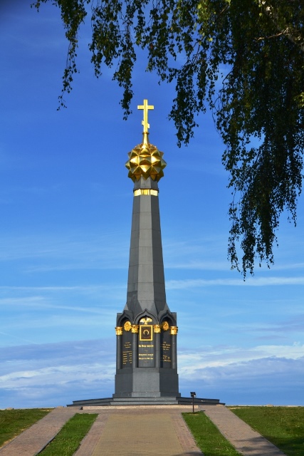 «На развилке дороги, ведущей от деревни Семёновское к Спасо-Бородинскому монастырю и деревне Шевардино, возвышается величественный памятник, имеющий название «Благодарная Россия – своим защитникам».