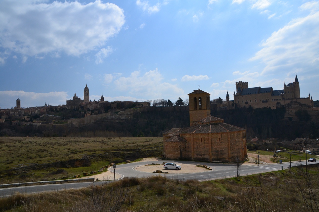 Мы въезжали со стороны Вальядолида, и здесь с высоты холма видно самые интересные строения в Сеговии (не видно только акведук): слева – Кафедральный собор, справа – крепость-алькасар, впереди – церковь Веракрус.