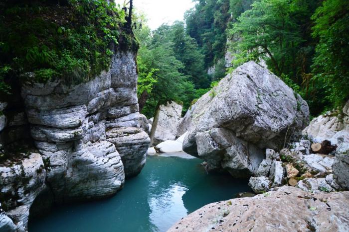 Продолжаем знакомство с природными красотами в районе Красной Поляны и Сочи: в каньоне Белые скалы мы уже побывали, теперь предлагаю отправиться еще в несколько мест, где можно отлично переждать полуденный летний зной, освежиться, а заодно и пройти пару-тройку километров.