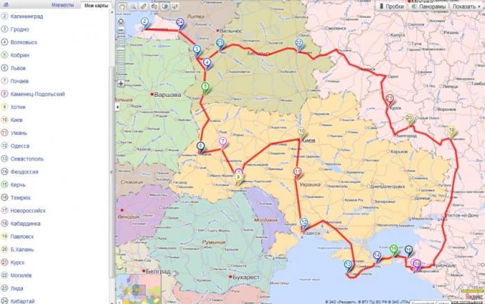 Маршрут: Калининград – Кибартай – Друскининкай – Гродно – Волковыск – Кобрин – Ковель – Львов – Почаев – Каменец-Подольский – Хотин – Киев – Умань – Одесса – Севастополь – ЮБК – Феодосия — Керчь – Темрюк – Новороссийск – Павловск – с.Б.Халань – Белгород – Курск – Могилёв – Лида – Гродно – Друскининкай – Кибартай – Калининград