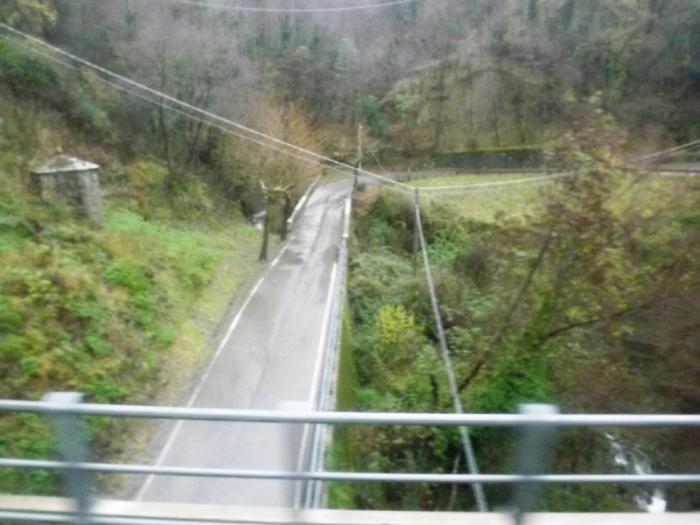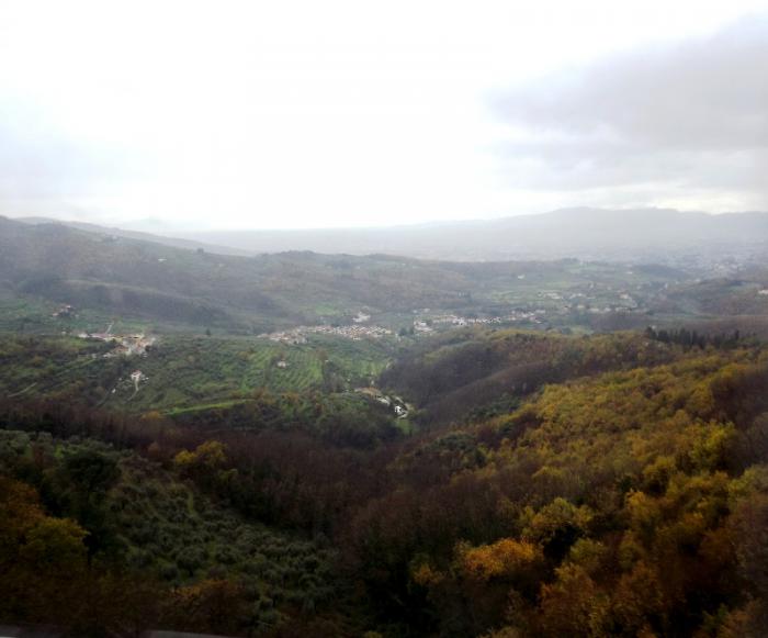 Итак в Пистойе я сел в пригородный поезд-il treno regionale, чтобы проехать по одной из интересных старых железнодорожных линий Италии-Порретане. Это старейшая железнодорожная магистраль через Апеннины.была официально открыта Королем Витторио Эммануилом II в 1864г.В то время это был огромный инженерный проект с его 47 туннелями и 35 мостами и путепроводами, общей длиной 99 км от Пистойй до Болоньи. Проехаться по этой дороге тем более, что она вписывалась в мой маршрут планировалось мною еще при составлении маршрута. Но вмешалась погода: моросящий дождик и пасмурное небо.Хорошие фотографии из окна поезда сделать не удалось. Но вот только такие: