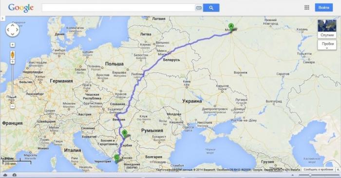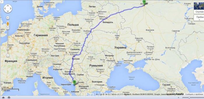 Вариант 1:протяженность 2700 км. Москва-Белоруссия (Брест)-переход Домачево — Польша — Словакия — Венгрия — Хорватия — Босния и Герцеговина — Черногория.
