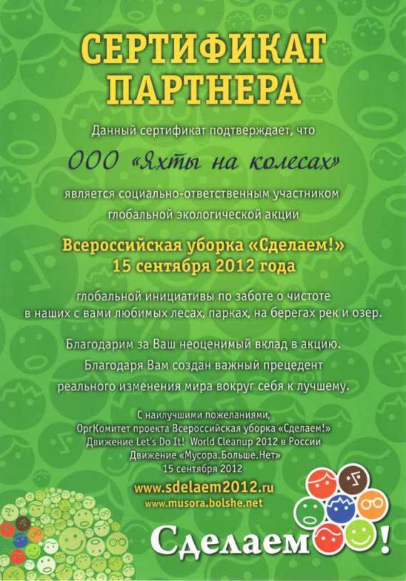 15 сентября 2012 года состоялась самая масштабная гражданская акция по уборке мусора в России – «Всероссийская уборка «Сделаем!». Компания «Яхты на колесах» не осталась в стороне: наш автодом отправился в путешествие вместе с борцами за чистоту природы. Так, «Яхты на колесах» и наши автодома побывали в Великом Новгороде, Москве, Рязани, Владимире, Ярославле, Вологде, Тихвине и Санкт-Петербурге.