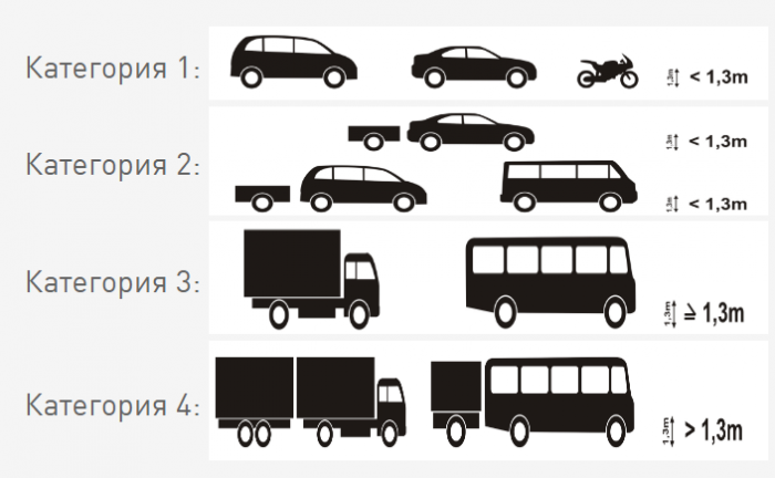 Категория 1: Автомобили, высотой макс. 1,70 м и длиной макс. 5,50 м (автомобиль, мотоцикл)
