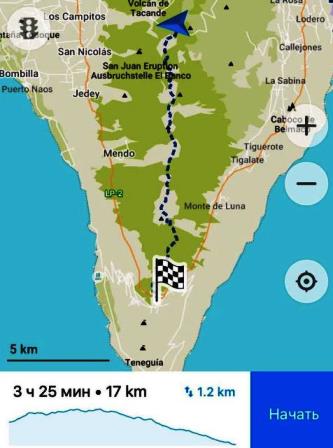Не верьте планировщику маршрута из вышеприведенного скриншота: в итоге мы протопали 26 километров и потратили на это семь часов. Остаток пути мной был преодолен в стиле «Я старый солдат и не знаю слов любви» — но если бы представилась такая возможность, я без колебаний повторила бы пеший маршрут вдоль вулканической гряды южной части острова Ла Пальма.