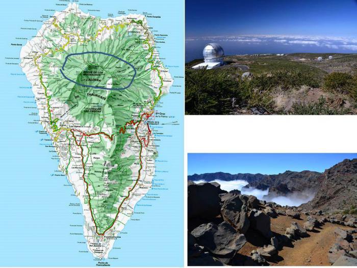 А еще – поднимемся на самую высокую точку острова Rogue de los Muchachos и полюбуемся инопланетными видами зданий астрофизической лаборатории (актуальный район на схеме обведен синей линией).