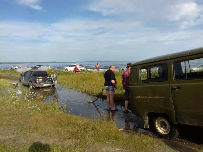 Когда ехали в Тоню, мы благополучно прозевали отлив, а вместе с ним и ровную отливную гладь, по которой можно доехать, есть вторая дорога и мы с Аннике её знали, она в том году радовала бродами по лобовое и каками, что можно метнуть выше сосен. Но последние несколько недель, жаркие и сухие, изрядно поубавили количество воды в бродах, которые мы всё равно промеряли по дороге сюда. Экипаж эльки, к отъезду, тоже благополучно прозевал отлив и выбирался этим, «оффроудным» вариантом.
