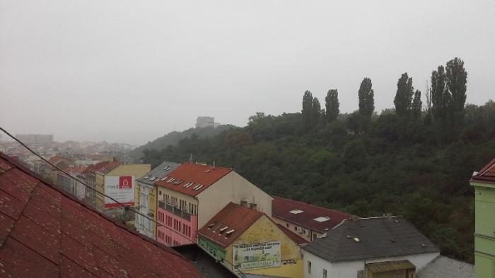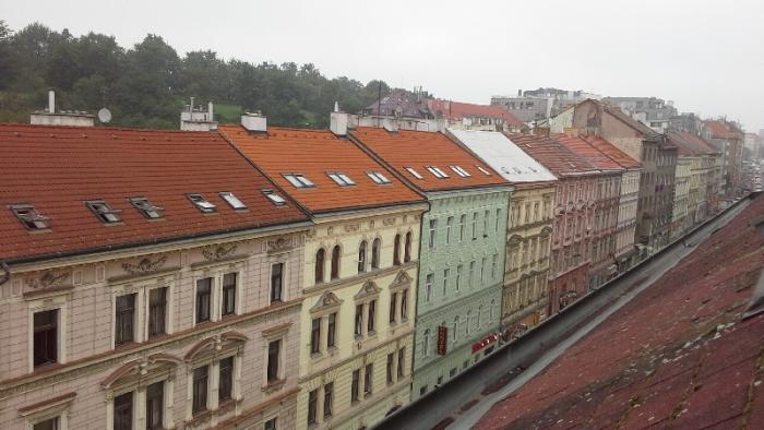 Перед отелем удобная парковка несколько мест принадлежат отелю.Оставляем машину на все время прибывания в Праге, т.к судя по предыдущим многочисленным отчетам по городу надо передвигаться или пешком или на трамвае.Отель расположен в районе Витков. Вот такой вид открывается если открыть фрамугу окна, выходящего на крышу