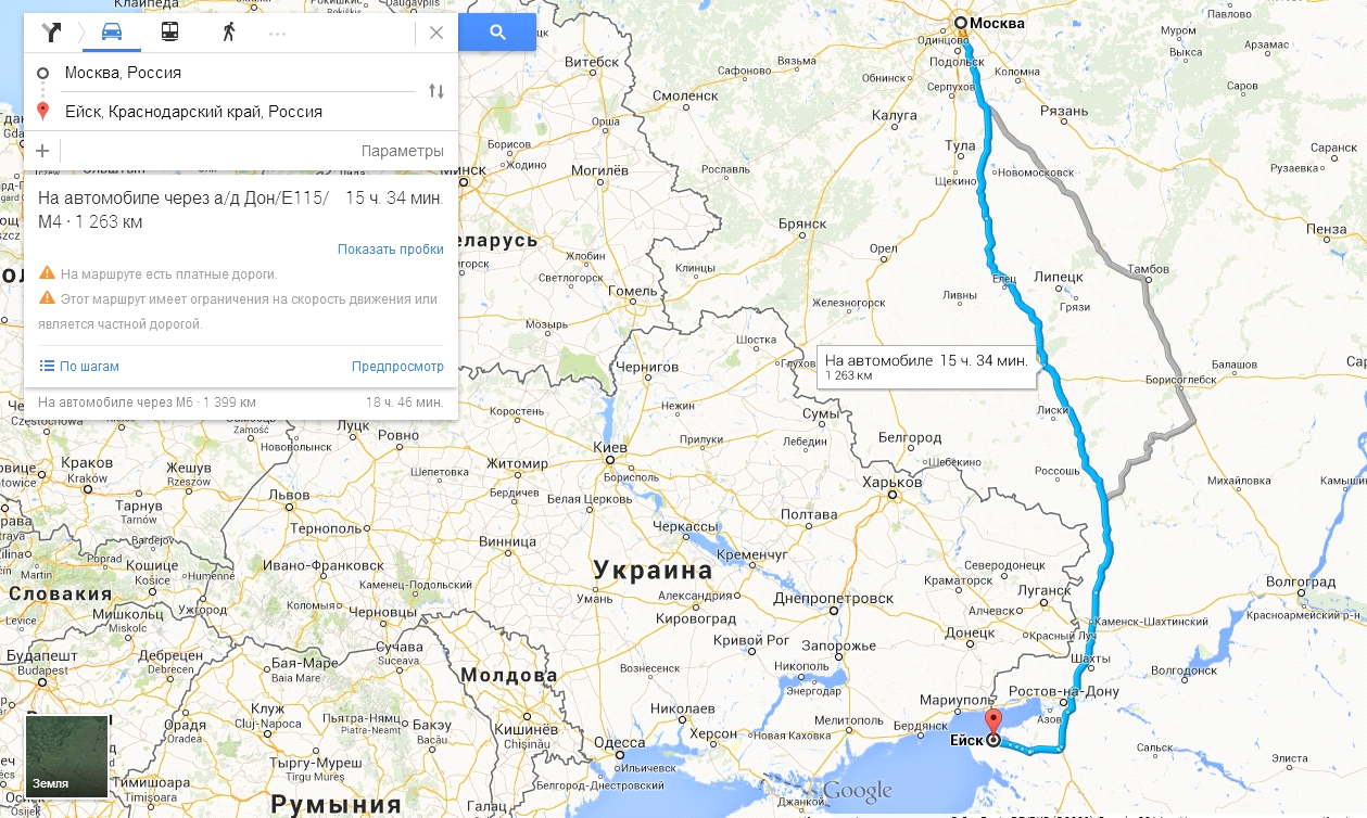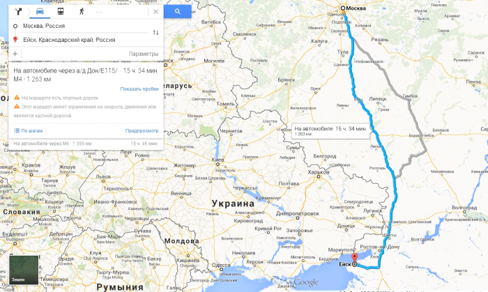 Решили с женой прошлым летом отдохнуть на море в Краснодарском крае. Выбор пал на город Ейск, так как у жены там родственники живут. По этому направлению ехали первый раз, так что дороги не знали. Как всегда спасли карты гугл :)